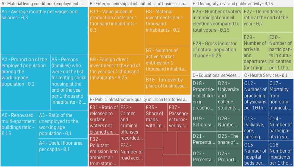 Life quality indicators can statistically assess and show various complementary aspects of life quality, thus complementing the gross domestic product indicator, which is traditionally used as a measure of a country’s economic and social development. Life quality indicators at EU Member State level are assessed by Eurostat. Most of the Life quality indicators provided by Eurostat are not collected at the municipal level, so similar indicators were included in the Municipal Life Quality Index (LQI), which were grouped into 6 categories. It should be noted that Eurostat Life Quality surveys use large-scale representative surveys to assess life quality, which are not included in this assessment of municipal LQI’s, but use indicators collected at the municipal level that could at least partially lead to satisfaction of life quality. The basis of the Municipal LQI is the Life Quality Model and Index, which was used in the assessment of the impact of EU structural assistance on the life quality, social exclusion and poverty reduction in Lithuania. Life quality in this model was associated with the ability to ensure a sufficient level of material well-being, which is defined by work and employment- related income and housing. Improving life quality is due to satisfaction of health condition, increased access to education and social services, increased participation in cultural life, as well as a favorable living environment – decreasing environmental pollution and increased level of public safety. This Municipal LQI was compiled based on an analysis of the scientific and empirical literature and a review of life quality indices calculated by international organizations.